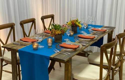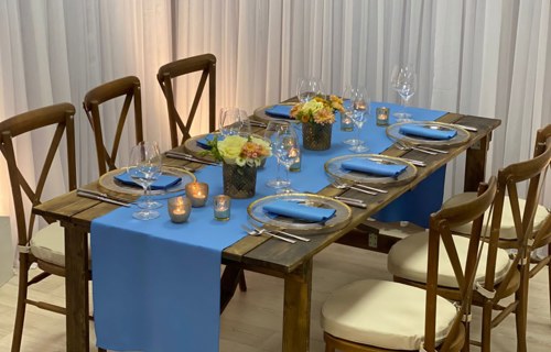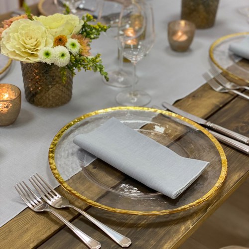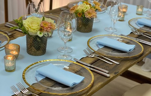 © 88 Events - Sky blue Essential runner & napkins with gold Trim chargers on Rustic table