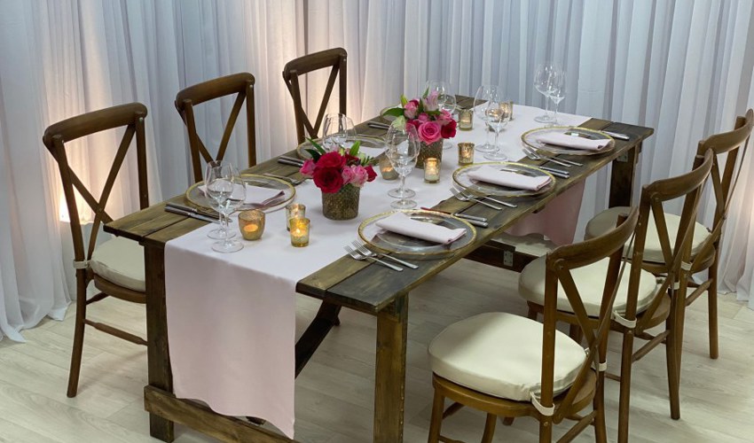 © 88 Events - Pink almond Gelato runner & napkins with gold Trim chargers on Rustic table
