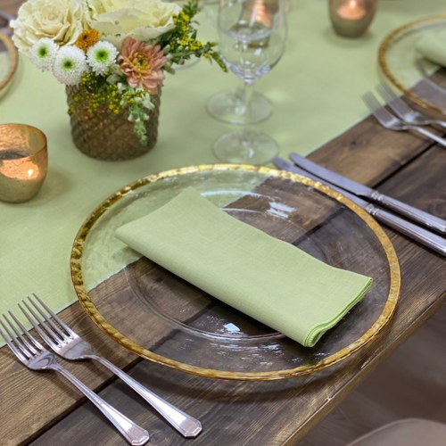 Pistachio Gelato runner & napkins with gold Trim chargers on Rustic table