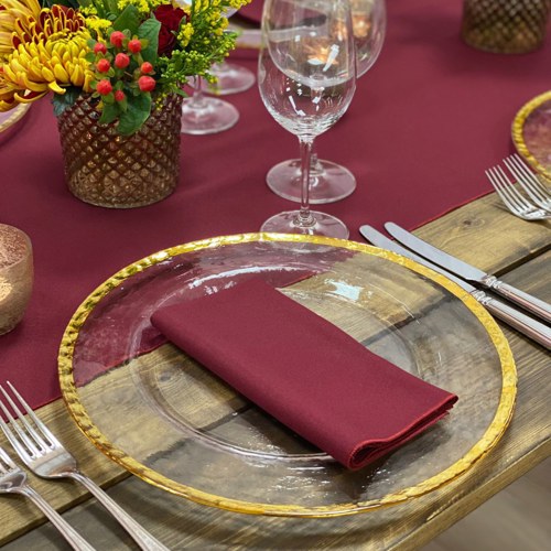 Wine Essential runner & napkins with gold Trim chargers on Rustic table