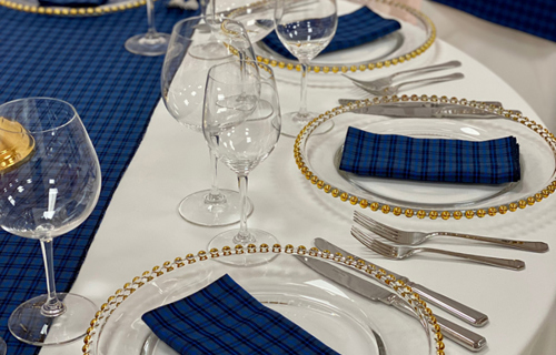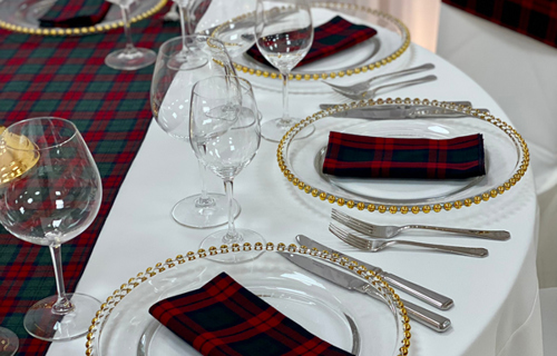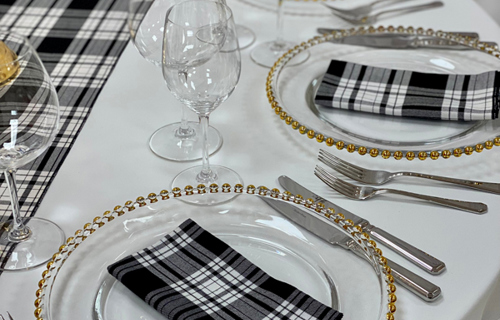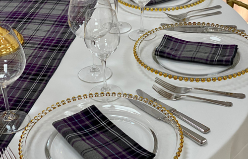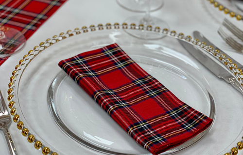 © 88 Events - Royal Stewart Tartan napkin & runner, white Essential linen & gold beaded charger plate