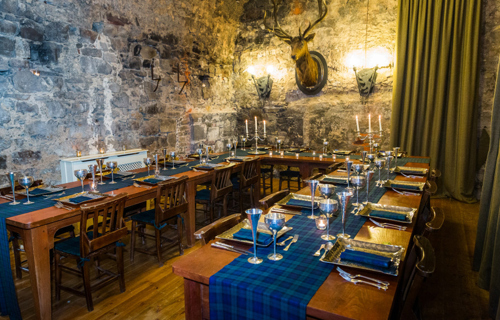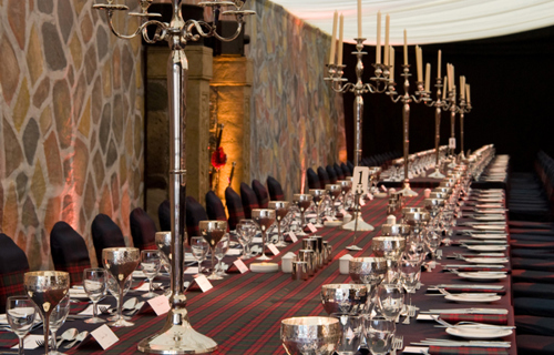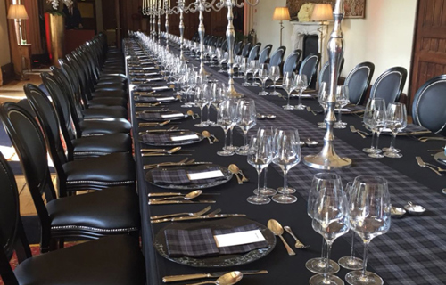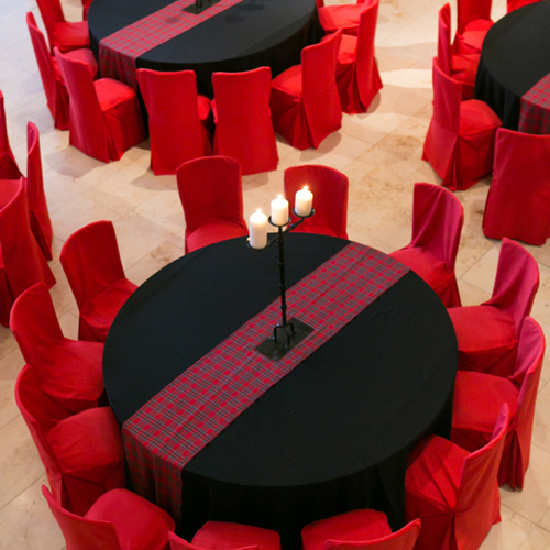 © 88 Events - Royal Stewart Tartan runner, black Essential linen, red Essential chair covers & wrought iron candelabra