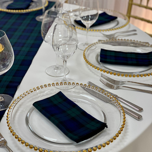 © 88 Events - Blackwatch Tartan napkin & runner, white Essential linen & gold beaded charger plate