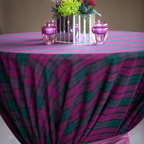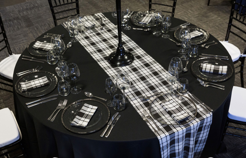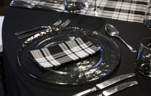 © 88 Events - Menzies Tartan napkin & runner, black Essential linen & smoke grey charger plate