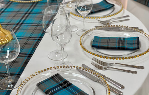 © 88 Events - Menzies Tartan napkin & runner, white Essential linen & gold beaded charger plate