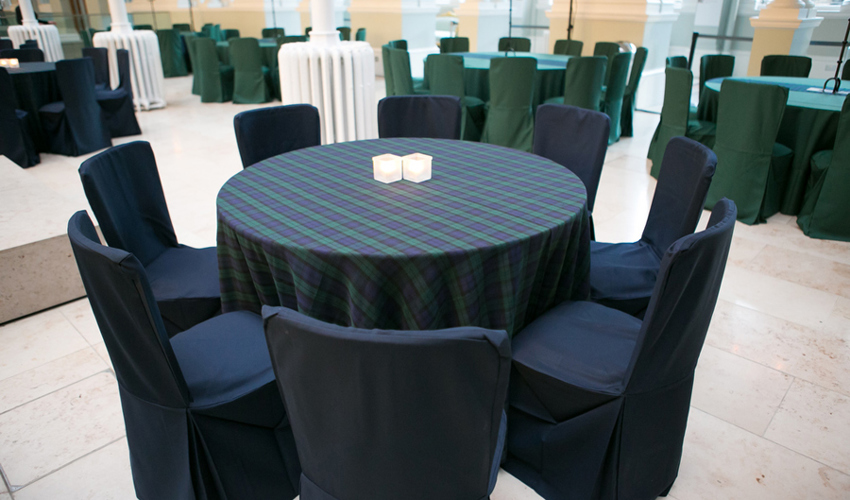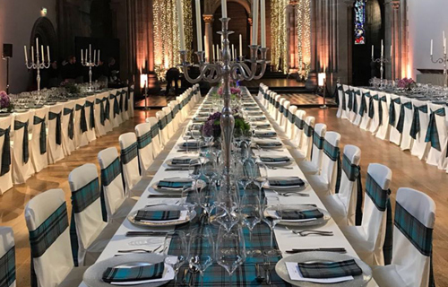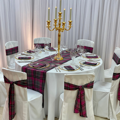 © 88 Events - Iona Tartan napkin & runner, white Essential linen & chair covers with Iona Tartan ties & gold candelabra