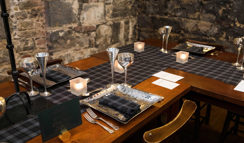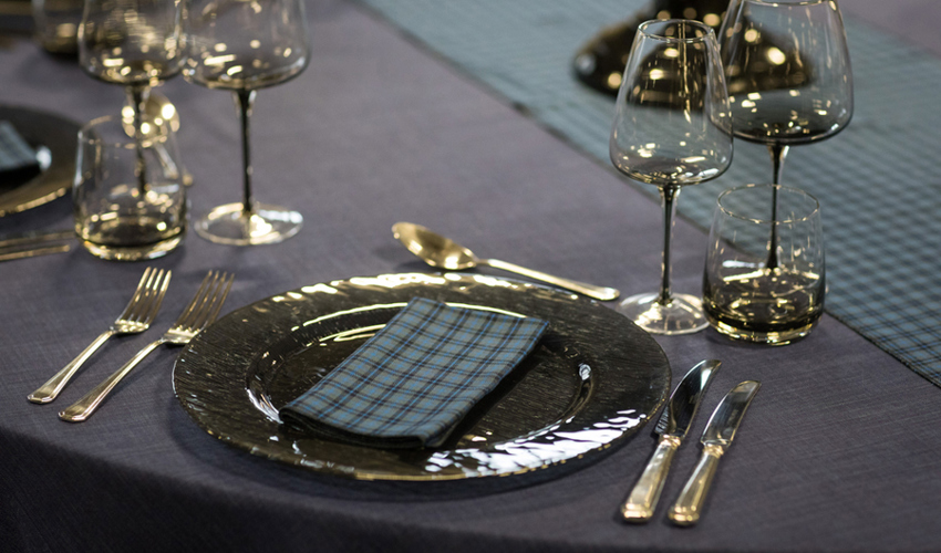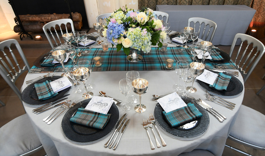 © Benugo Events - Eilidh Tartan runner & napkins, grigio Gelato linen & smoke grey chargers