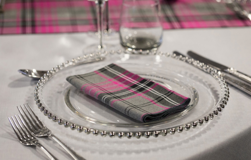 © 88 Events - Iona Tartan napkin & runner, grigio Gelato linen & silver beaded charger plate