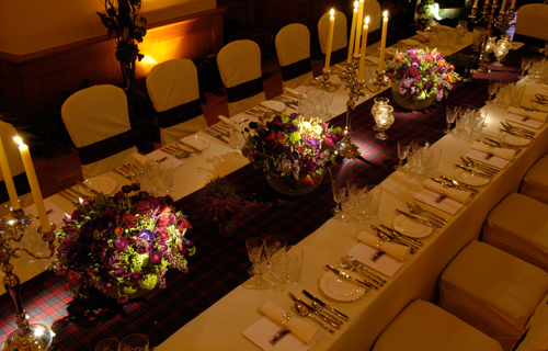 Iona Tartan napkin & runner, white Essential linen & chair covers with Iona Tartan ties & gold candelabra