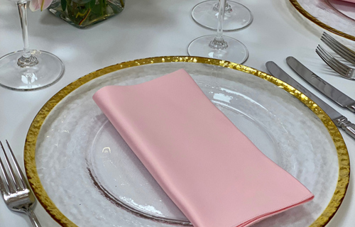 © 88 Events - Blush Verona napkin, white Essential linen & gold trim charger plate