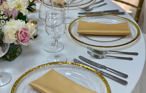 © 88 Events - Golden Verona napkins, white Essential linen & gold trim charger plates