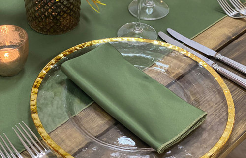 © 88 Events - Moss Verona napkin & runner, gold trim charger plate & rustic table