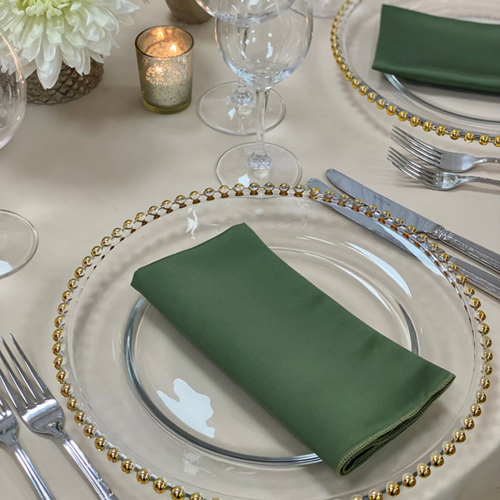 © 88 Events - Moss Verona napkin, nude Verona linen & gold trim beaded charger plate