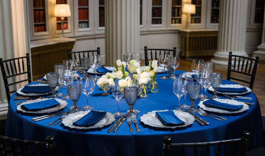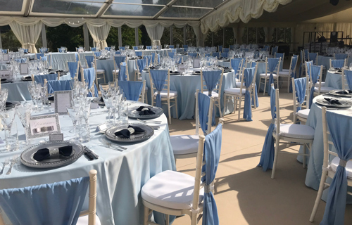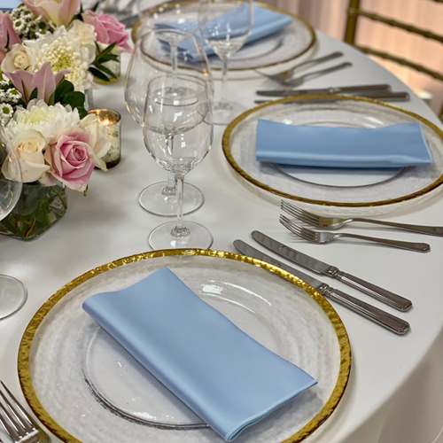 © 88 Events - Powder blue Verona napkins, cream Essential linen & gold trim charger plates