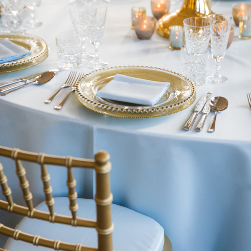 Powder blue Verona linen & napkin, gold beaded charger plate & gold Chiavari chair with powder blue pad