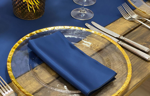 Powder blue Verona napkins, cream Essential linen & gold trim charger plates