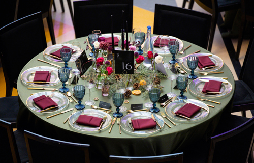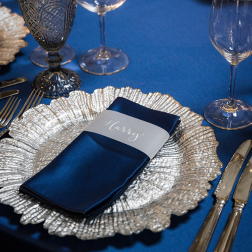 © 88 Events - Twilight Verona linen & napkin, silver Petal charger plate & smoke goblet