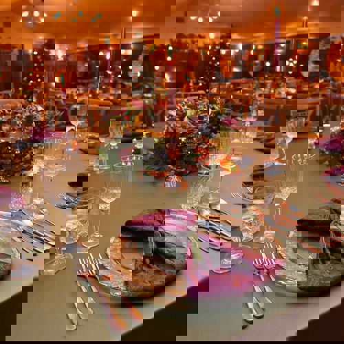 © 88 Events - Twilight Verona linen, fuchsia Essential napkin & gold beaded charger plate