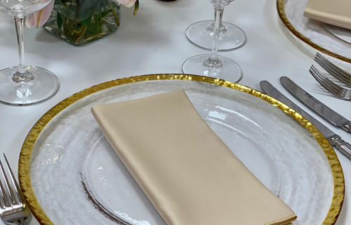 © 88 Events - Nude Verona napkin, white Essential linen & gold trim charger plate