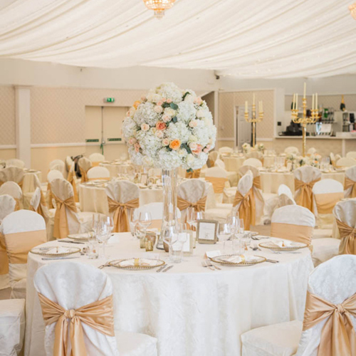 © 88 Events - Cream Damask linen & chair covers with champagne Faux Silk ties