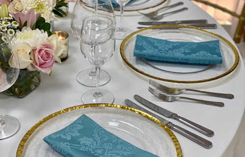 © 88 Events - Duck Egg Damask napkin, white Essential linen & gold trim charger plate