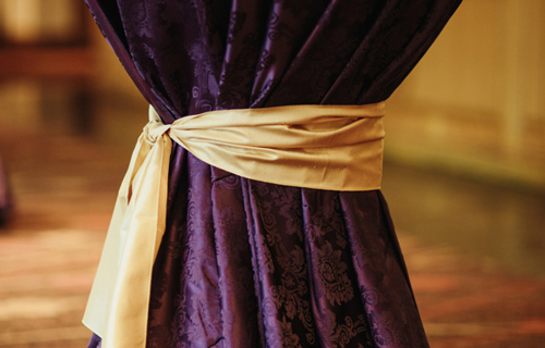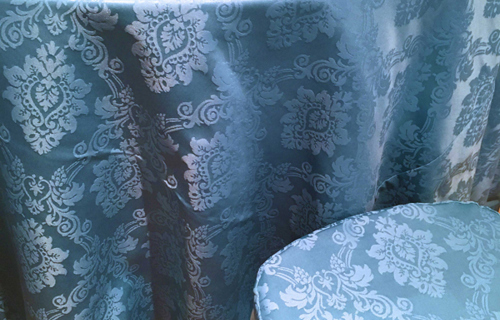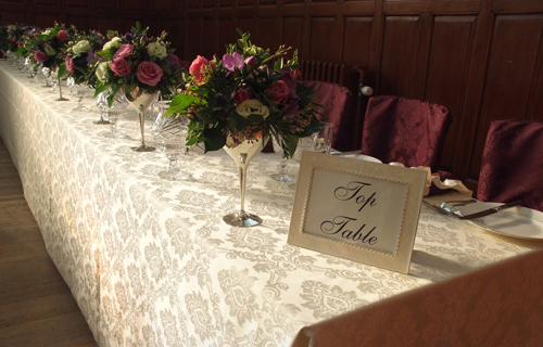 Latte Damask linen, damson Damask chair covers & pewter goblets