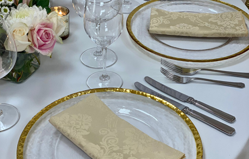 © 88 Events - Latte Damask napkin, white Essential linen & gold trim charger plate