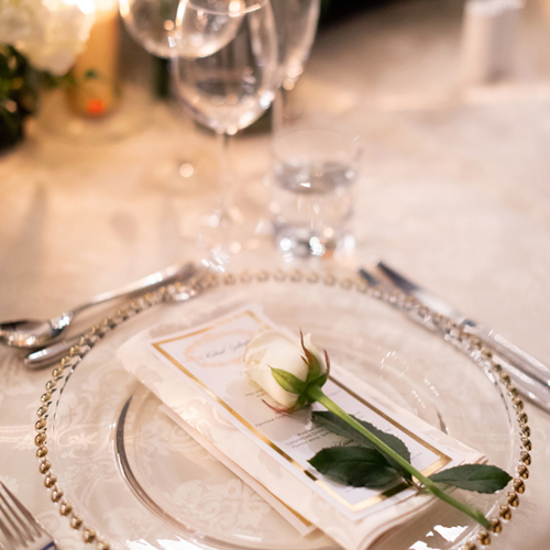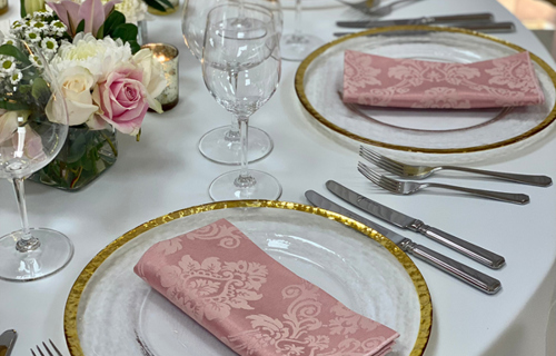 © 88 Events - Misty rose Damask napkin, white Essential linen & gold trim charger plate