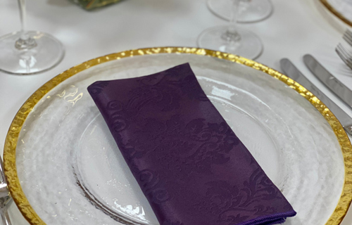 © 88 Events - Purple pout Damask napkin, white Essential linen & gold trim charger plate