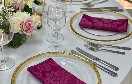 © 88 Events - Raspberry Damask napkin, white Essential linen & gold trim charger plate