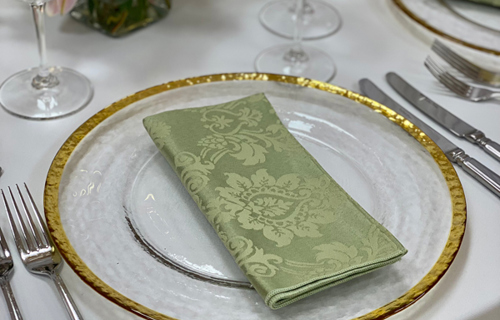 Sea green Damask napkin, white Essential linen & gold trim charger plate