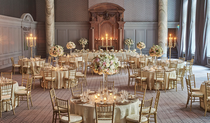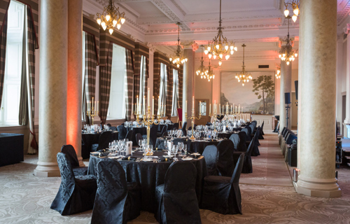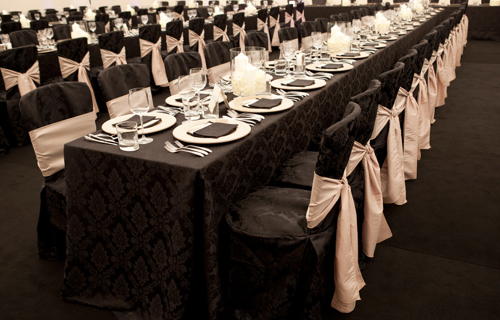 Noir Damask linen, napkins & chair covers with gold candelabra