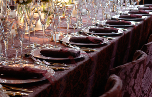 © 88 Events - Damson Damask linen, napkins & chair covers & heather charger plates