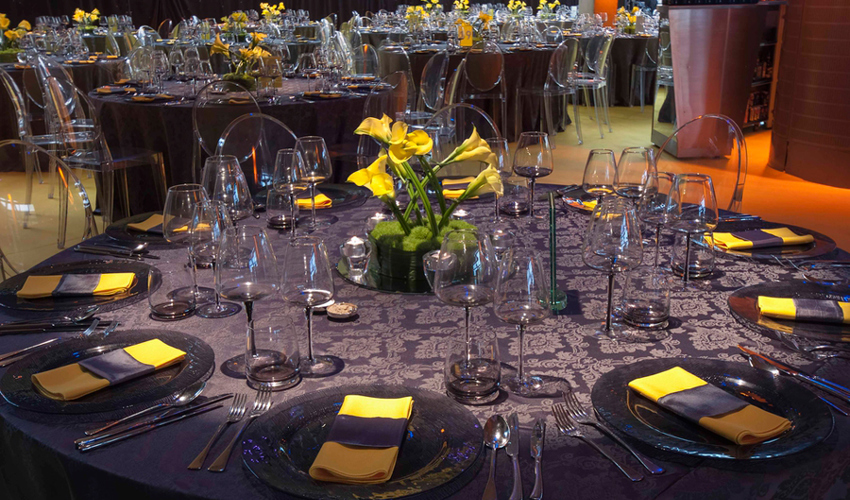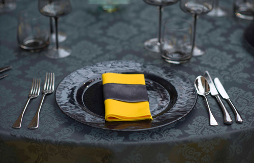 © 88 Events - Slate-grey Damask linen, yellow Essential napkin, smoke grey charger plates & glasses