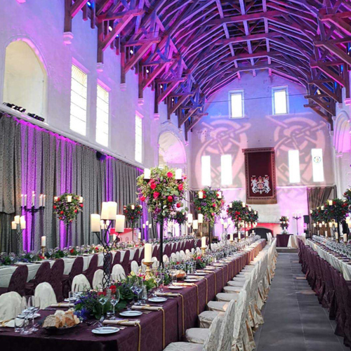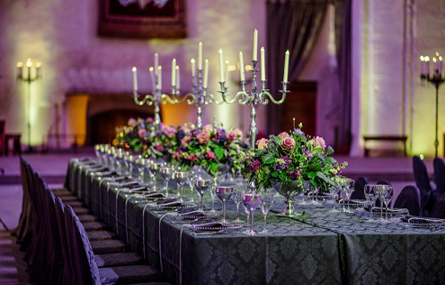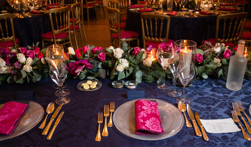 © Benugo Events - Slate grey Damask linen with purple pout Damask chair covers, petwer goblets & silver candelabra