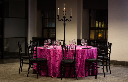 © 88 Events - Raspberry Damask linen, smoke grey glasses, black chiavari chairs & tall black candelabra