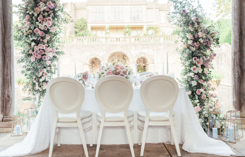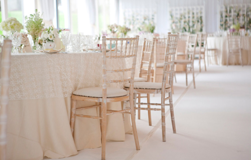 Ivory Vintage Lace overcloths, white French chairs & ivory Chiavari chairs