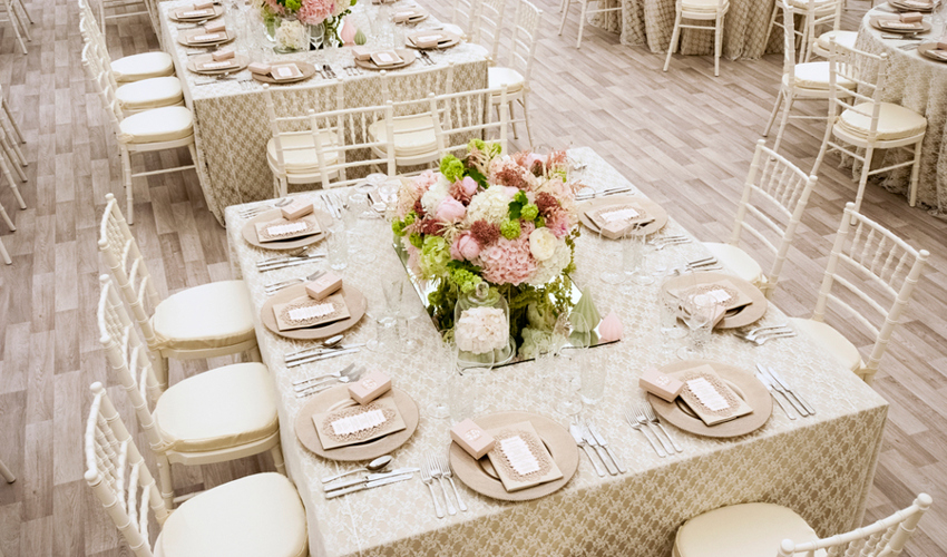 © 88 Events - Ivory Lace square overcloth on sand Milano linen with ivory Chiavari chairs & vanilla Milano pads